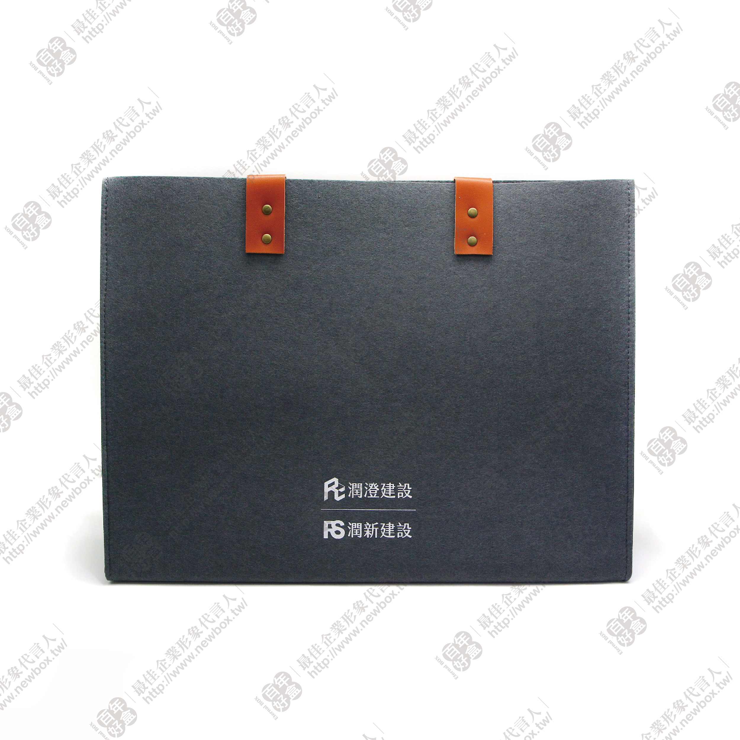 使用深灰色羊毛氈面料,印有白色可客製化LOGO,搭配咖啡色提把