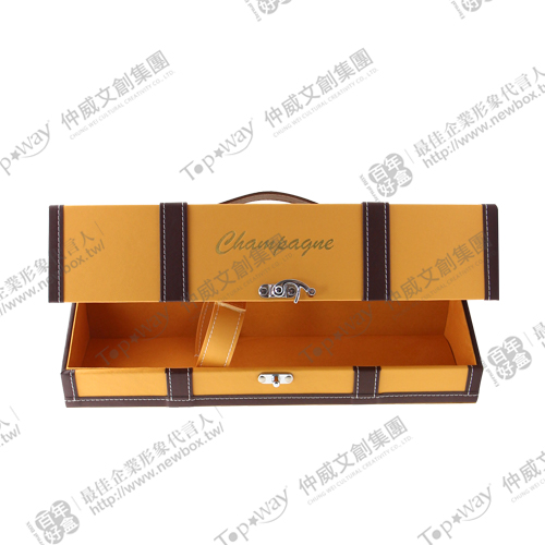 採用大面積亮黃底色,使整體產生明亮輕巧的觀感,再用深棕色細條滾邊, 顯現盒形立體感,是一款清新的皮革禮盒設計