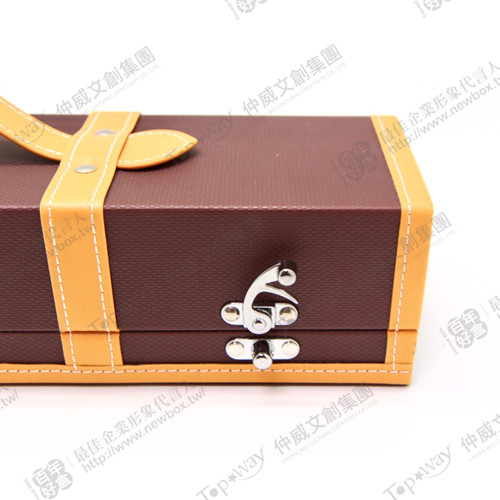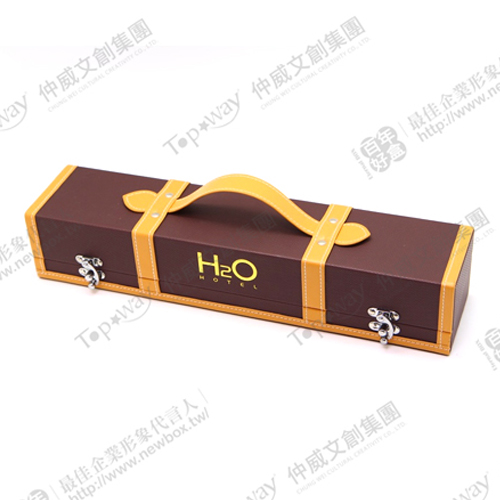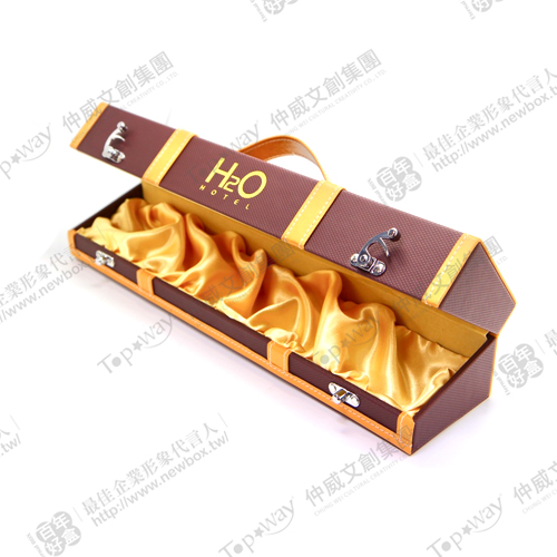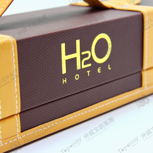 H2o水京棧國際酒店是位於高雄的現代化高樓飯店,此次委託百年好合設計的這款皮革高級禮盒,就是想做為中秋禮盒使用。在配色上使用溫暖的紅棕色搭配明亮的黃色,希望給顧客溫暖的 佳節氣氛。在細節的部分,開關則是使用金屬扣呈現,提升內容物的慎重感,內部採用滑面 金色襯布,增添貴族氣息。