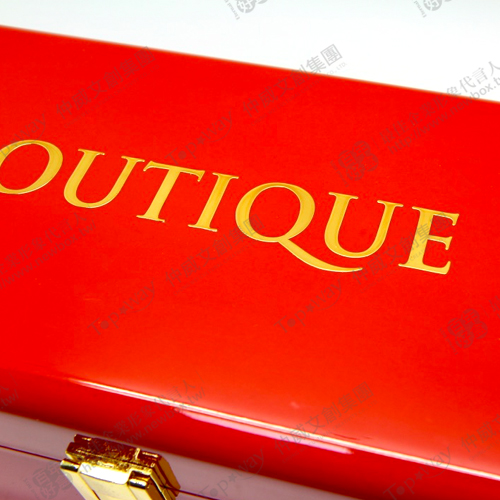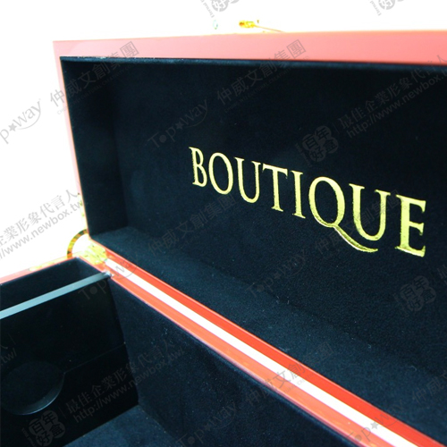 時尚亮紅印上簡約字形,配上黑色絨布內哩,呈現高檔質感