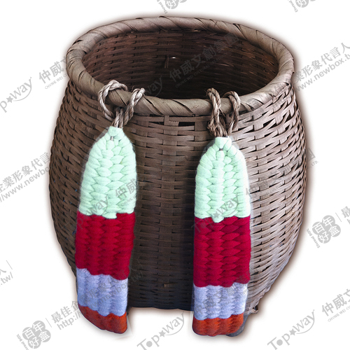 將傳統竹簍以大型毛織飾品裝飾,讓傳統竹器產生大膽鮮明的印象