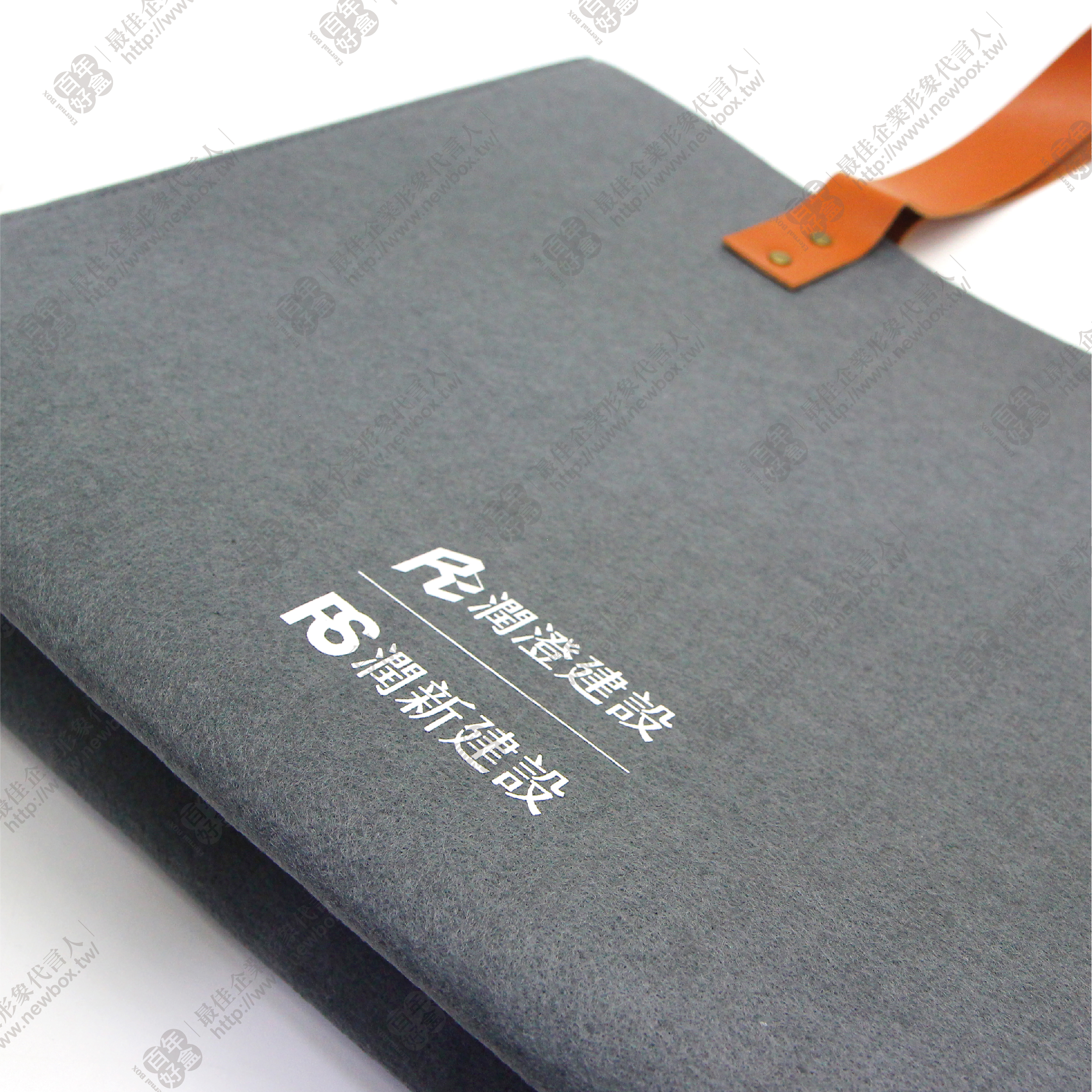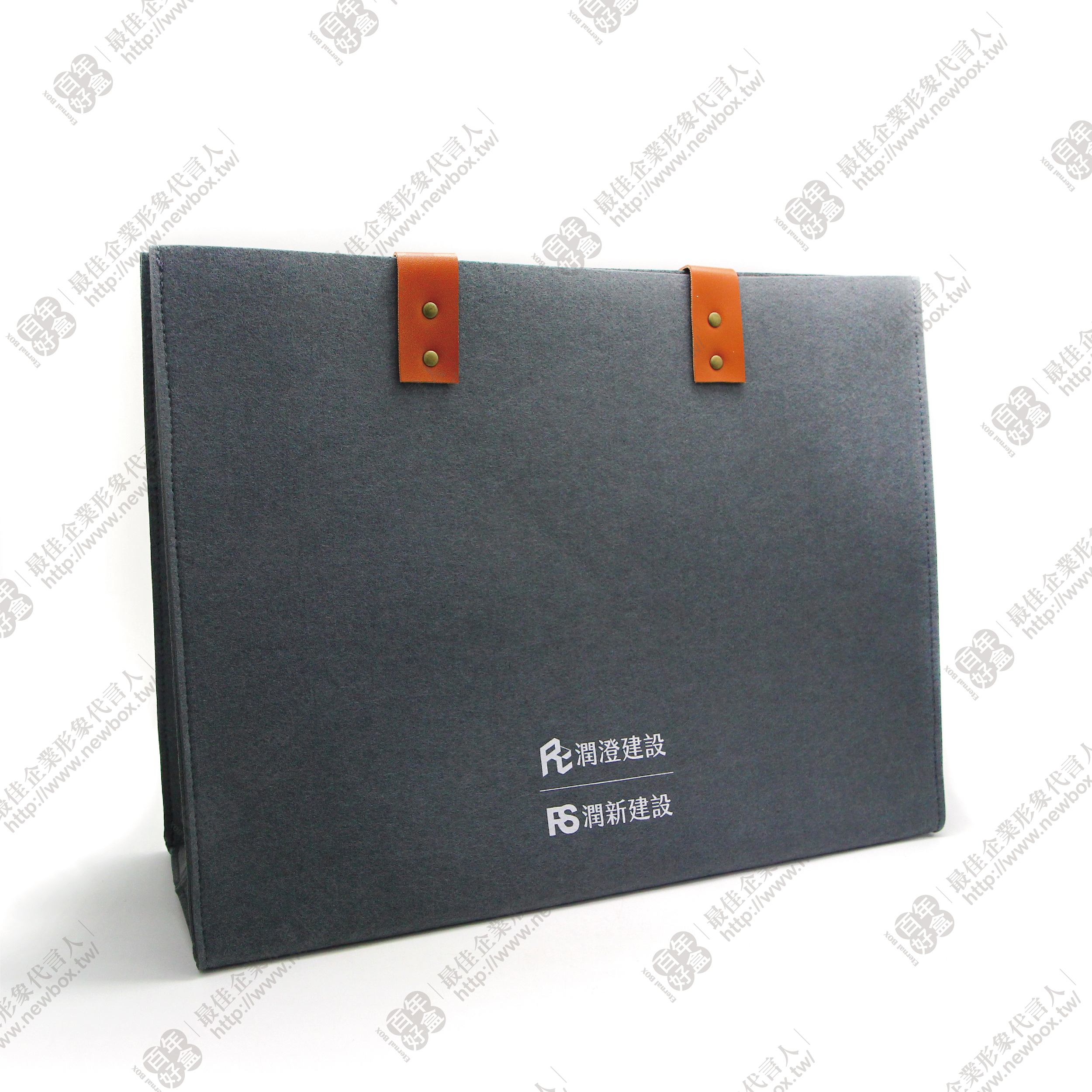 使用深灰色羊毛氈面料,印有白色可客製化LOGO,搭配咖啡色提把