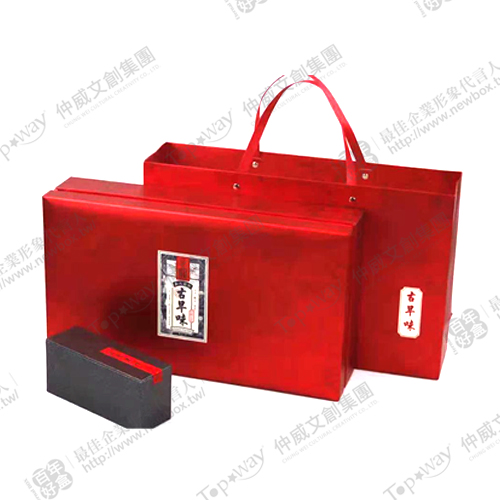 以亮紅色與黑、棕色設計,適合作為年節禮盒