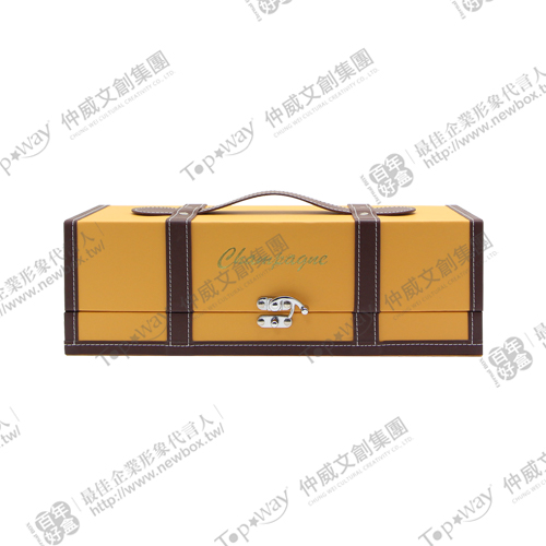 採用大面積亮黃底色,使整體產生明亮輕巧的觀感,再用深棕色細條滾邊, 顯現盒形立體感,是一款清新的皮革禮盒設計