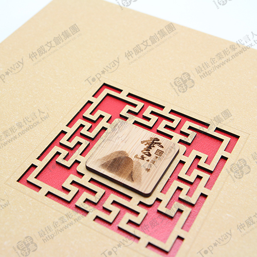 盒面以簍空方格呈現,木質面也有烙印中文字的設計,